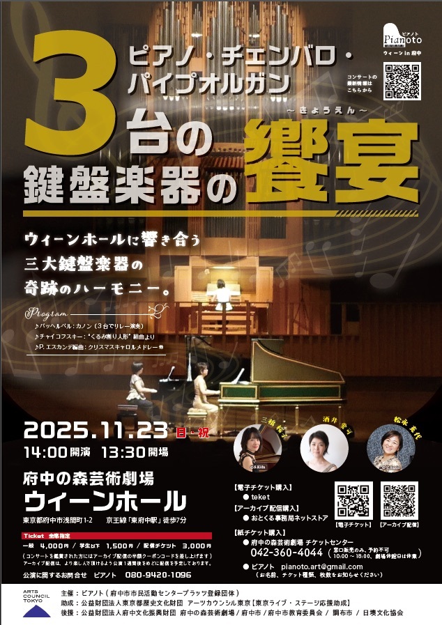 11月23日、府中の森芸術劇場 ウィーンホールにて、「ピアノ・チェンバロ・パイプオルガン 3台の鍵盤楽器の饗宴」を開催いたしました。ご来場くださった皆さま、応援してくださった皆さま、本当にありがとうございました。